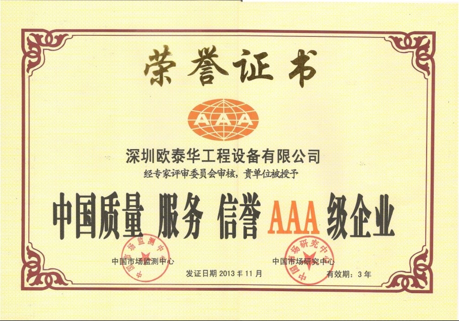 深圳歐泰華工程設備有限公司再展風采,經中國市場監測中心、中國市場研究中心,兩大權威認證機構的綜合考證及專家評審委員會審核,最終授予 “中國質量 服務 信譽AAA級企業”的殊榮;并頒發榮譽證書和牌匾。