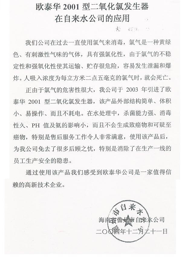海南省儋州市自來水公司-歐泰華二氧化氯發生器的應用