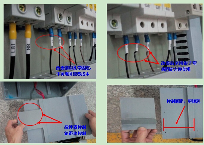 上月我司裝電人員胡小芽就發(fā)明了兩項小改善,不花成本,即可帶給你不一樣的視覺效果,瞧,這個小小的彎曲動作即可以固定標識不下滑,簡單且美觀;一個小小的四方模塊即可控制小電箱內(nèi)部間距,規(guī)范且美觀!