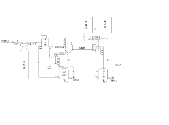 電解次氯酸鈉發生器由電解槽、硅整流電控柜、鹽溶解槽、冷卻系統及配套PUVC管道、閥門、水射器、流量計等組成。  將3~4稀鹽液加入電解槽內,接通12V直流電源,通過調節電解電流電解產生次氯酸鈉,由水射器吸收混合送出消毒,或用計量泵計量通過混合器送出消毒。