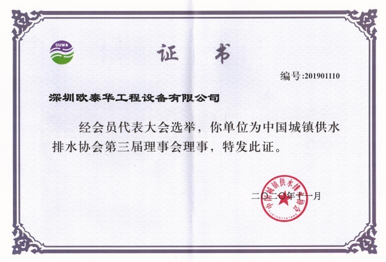 深圳歐泰華當(dāng)選中國城鎮(zhèn)供水排水協(xié)會第三屆理事會理事