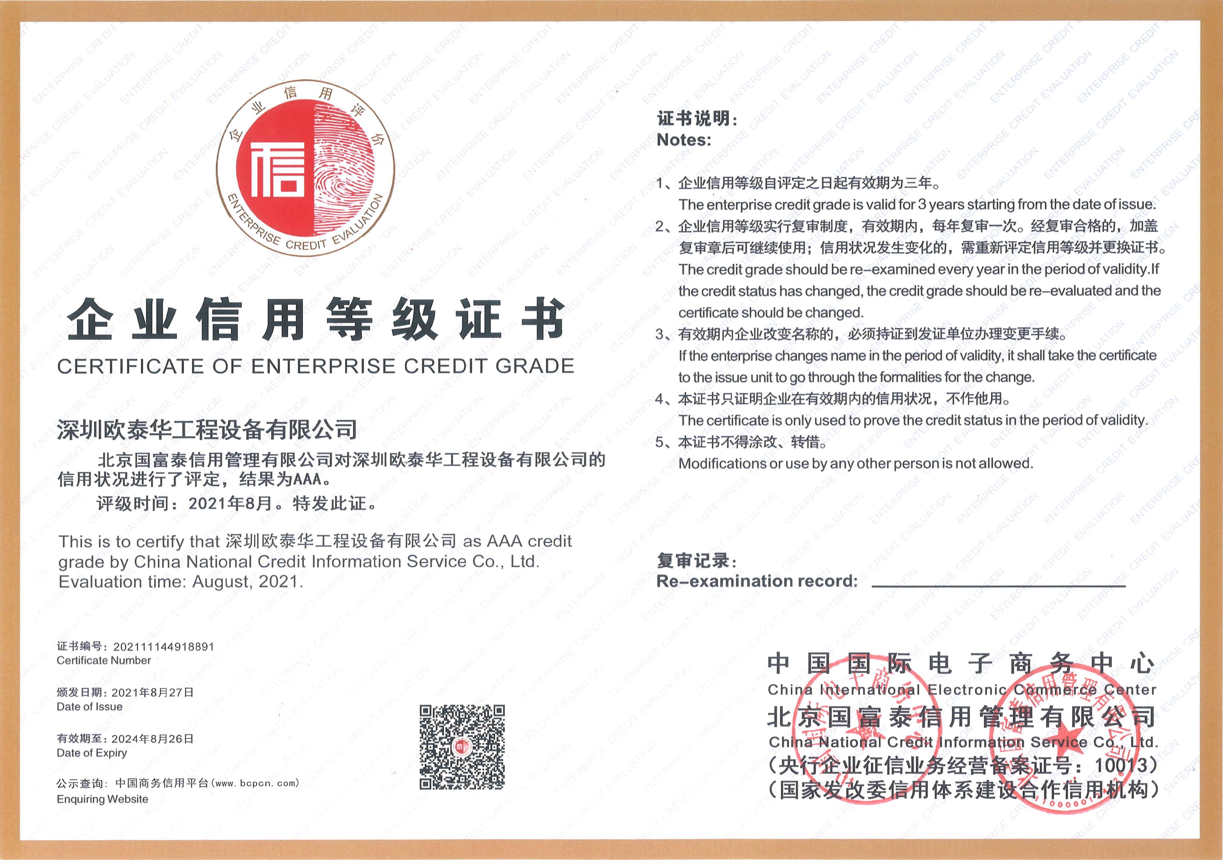 2021年8月,深圳歐泰華工程設(shè)備有限公司再次榮獲全國(guó)AAA級(jí)企業(yè)信用等級(jí)證書。此次獲得“AAA級(jí)企業(yè)信用等級(jí)認(rèn)證”,是對(duì)公司多年誠(chéng)信經(jīng)營(yíng)的最好詮釋。為歐泰華品牌的發(fā)展升級(jí),提供了強(qiáng)而有力的品牌財(cái)富。