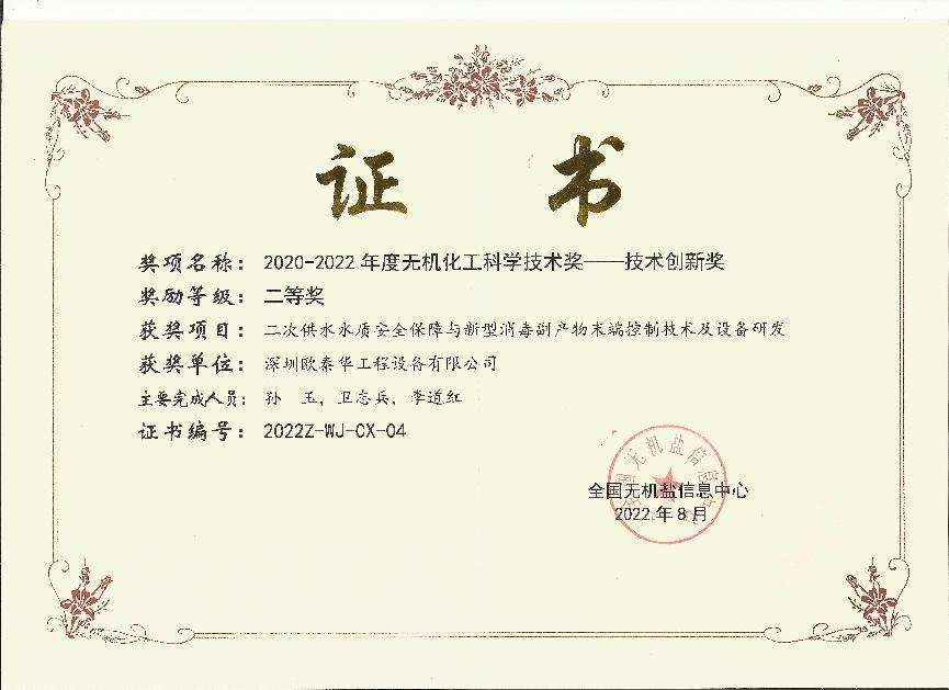 深圳歐泰華工程設(shè)備有限公司的《二次供水水質(zhì)安全保障與新型消毒副產(chǎn)物末端控制技術(shù)及設(shè)備研發(fā)》項(xiàng)目,榮獲2020-2022年度無機(jī)化工技術(shù)創(chuàng)新獎(jiǎng)。