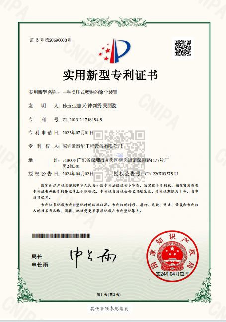 我們的負壓噴淋式除塵裝置以獨特的技術優勢,成功拿下國家實用新型專利。