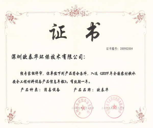 歐泰華二氧化氯發生器光榮入選農村飲水安全產品